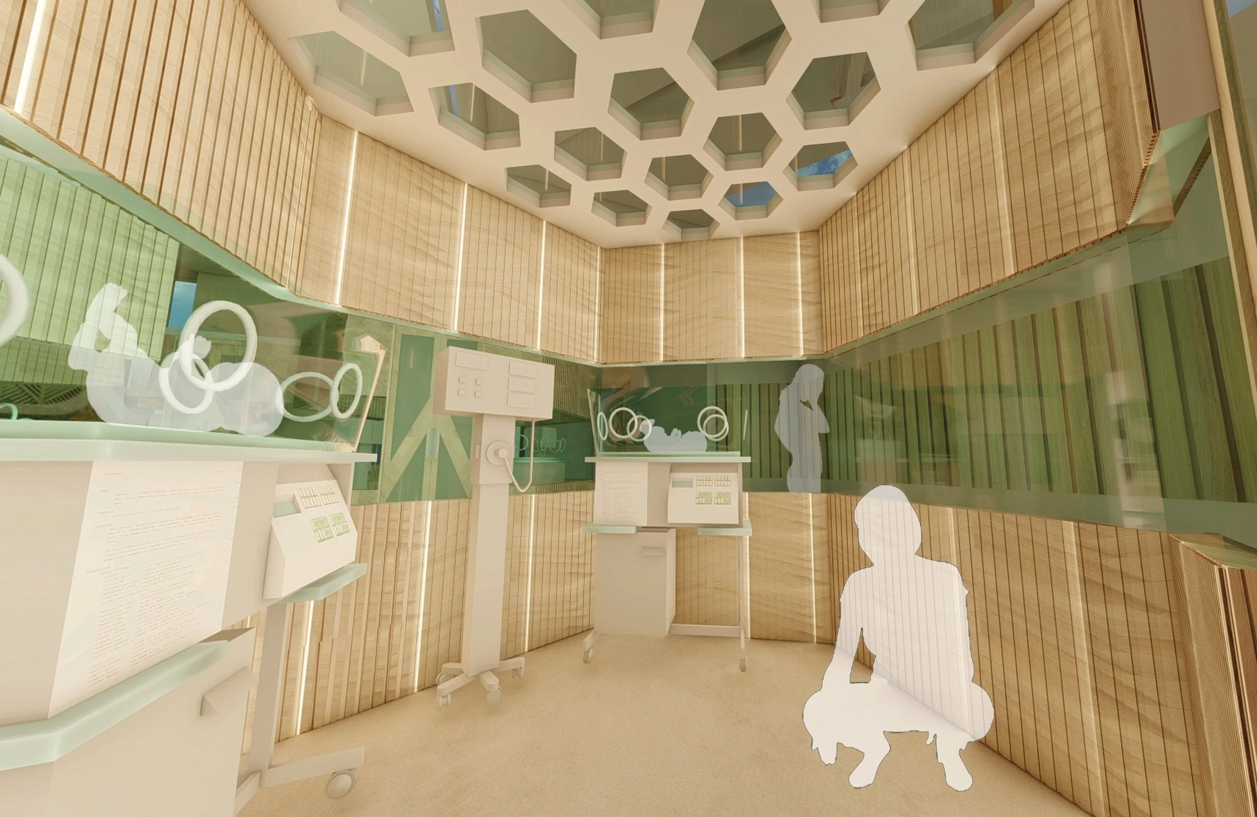 Long section of the entire site displaying the reception, waiting room, intensive care and interactive communal space.